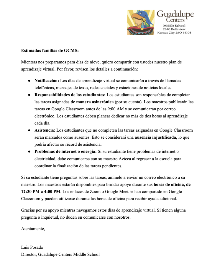 Thank you for your continued support and commitment to our school community. We look forward to a successful and productive season ahead. Sincerely, Luis Posada Principal Mil Gracias |